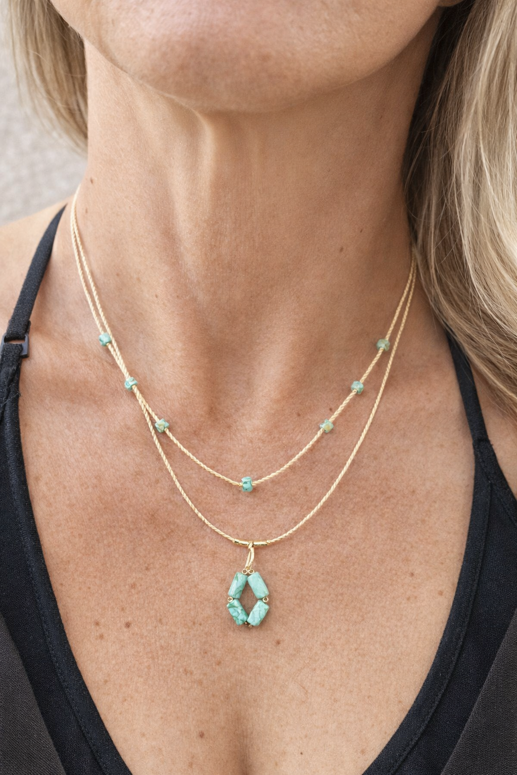 Fibra natural de palha da costa, pedra natural amazonita, partes em metal dourado com excelente banho em verniz marítimo.